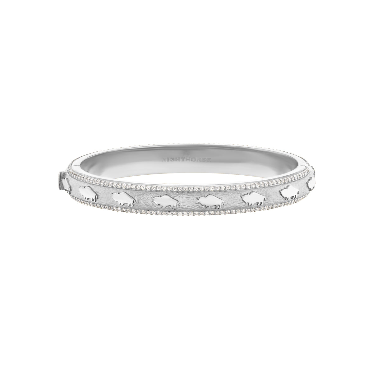 A thinner version of the original, this new Buffalo Mini bracelet is available in 18k gold or platinum with natural diamonds. With easy sizing and a carefully designed clasp, the Buffalo Mini bracelet is stackable. Combine with the Running Horse or Eagle Mini for a combined message of freedom, resilience, strength, and harmony.