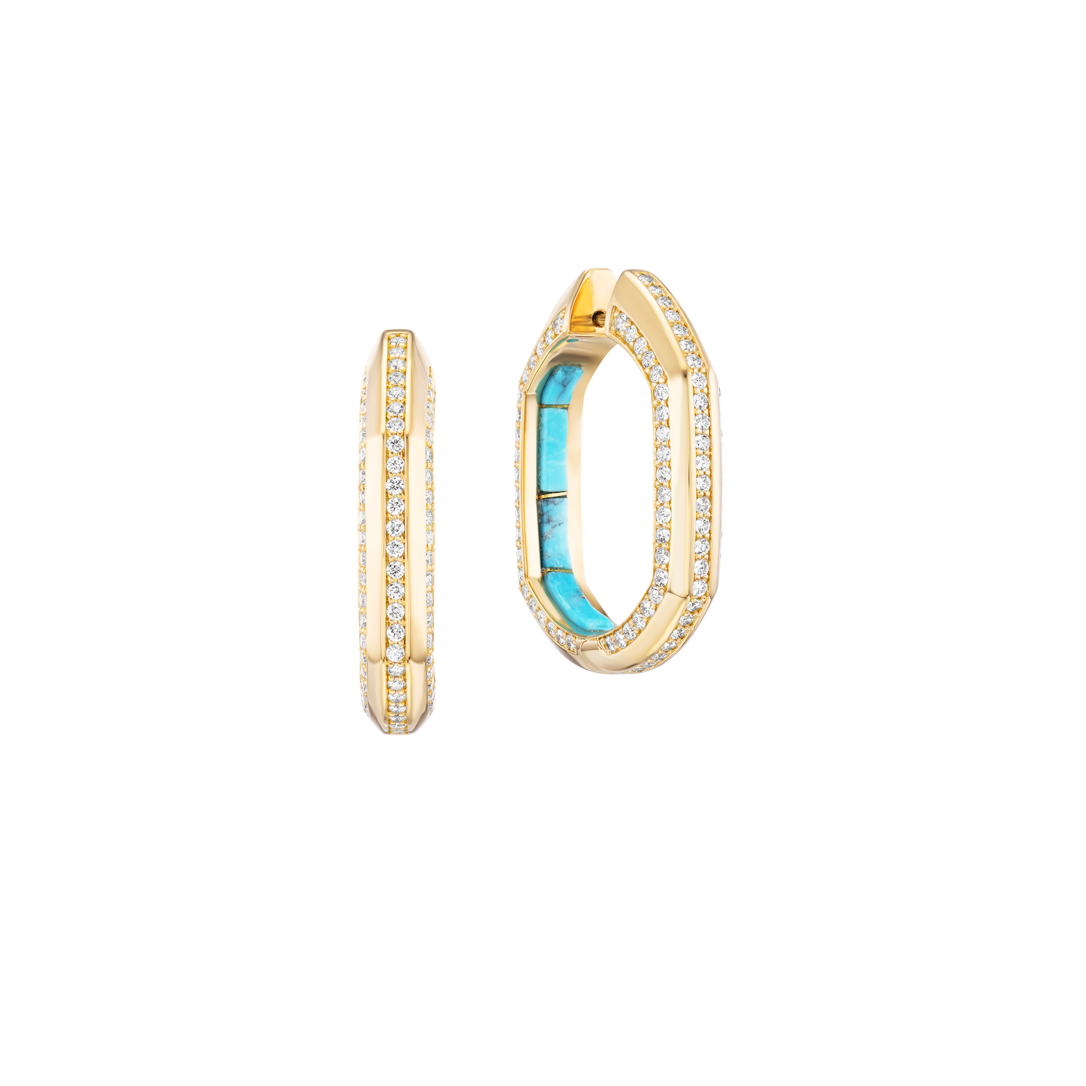 These new Desperado Hoops reference the design of that original bracelet. Available in either 18k gold or platinum, they are inlaid with diamonds on three sides and turquoise on one inside plane. Pair them with the freshly reimagined Desperado bracelet, making a statement gift for yourself or a loved one.