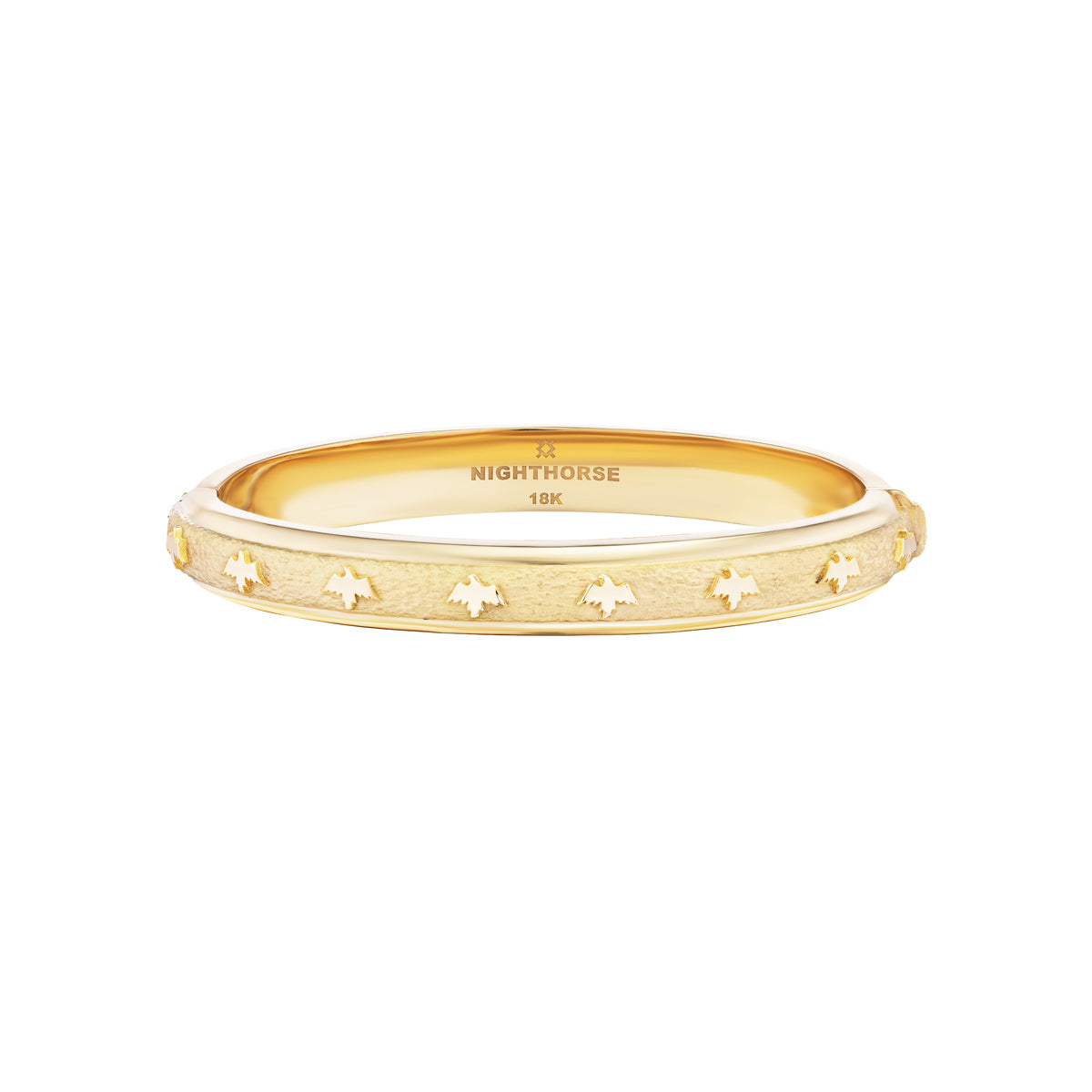 A thinner version of the original, this new Eagle Mini bracelet is available in 18k gold or platinum. With easy sizing and a carefully designed clasp, the Eagle Mini bracelet is stackable. A reminder of the bravery and honor these soaring birds embody. Combine with the Running Horse Mini for a combined message of freedom, strength, and honor.