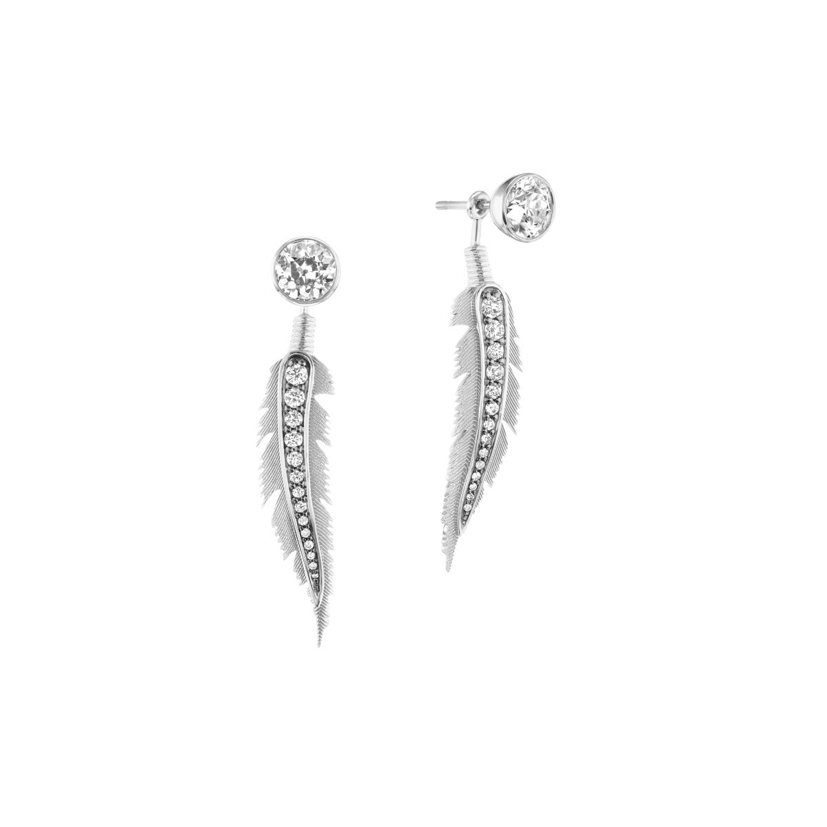 Set with 2.6-carat weight diamonds, in 18k gold or platinum, these delicate feathers can be slipped on or off the post, allowing you to wear just the diamond stud when desired. A stunning way to celebrate that strong, courageous, honorable man or woman in your life. Pair with the Feather pendant for a statement set.