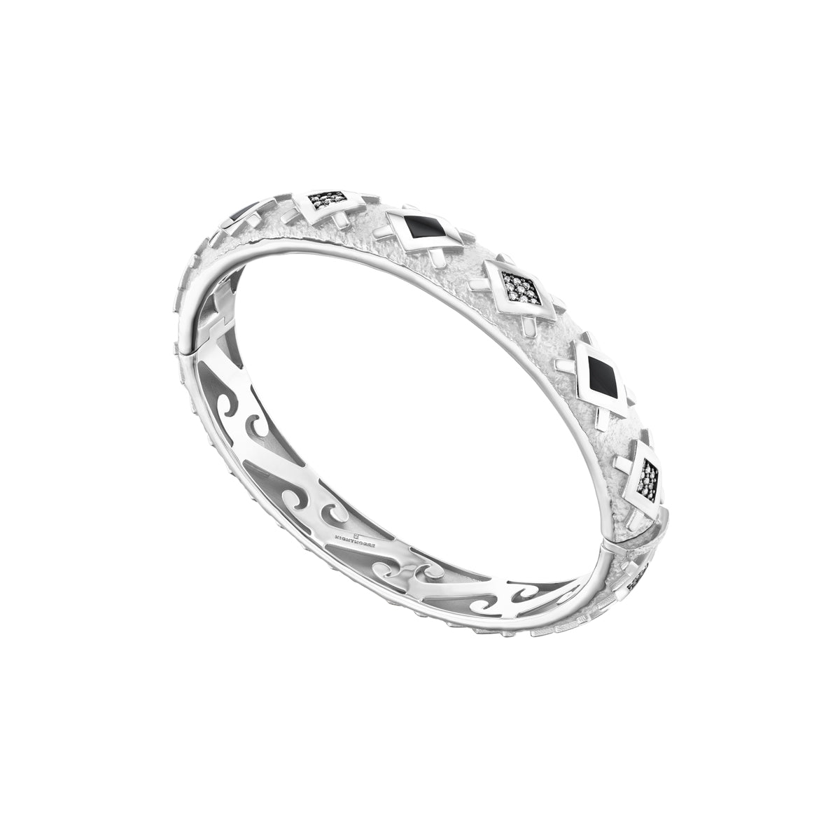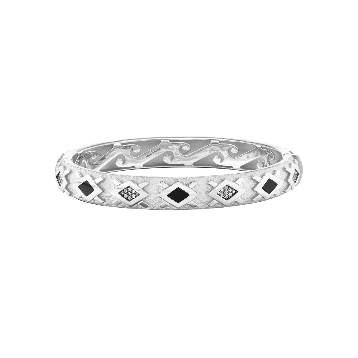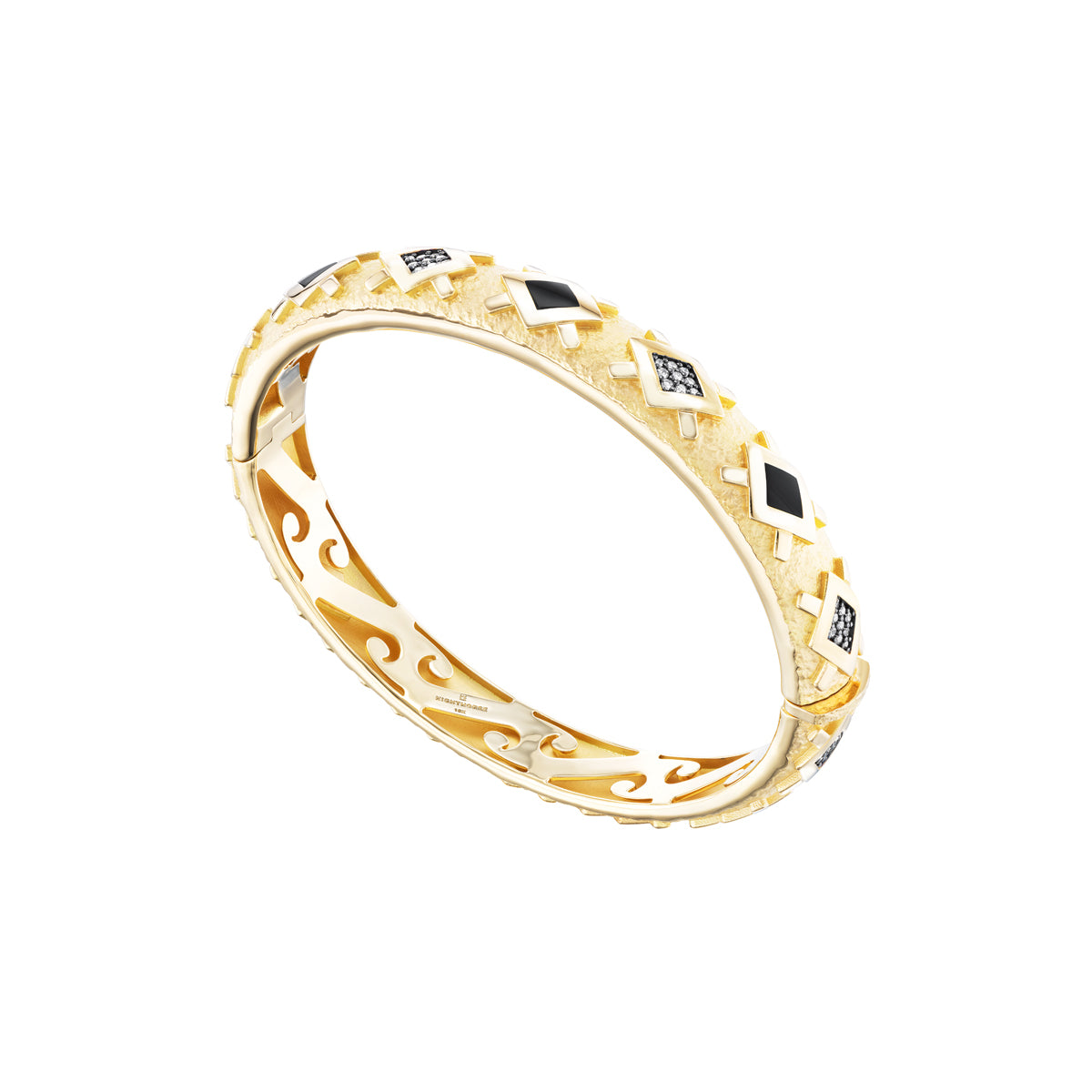 The Morning Star Bracelet carries that symbol as the focal point of its design. Set with either diamonds and turquoise or diamonds and black jade in 18K gold or platinum, this symbol of courage and strength of character is as meaningful now as it ever was. A secret wave pattern, known only to the wearer, adorns the interior.