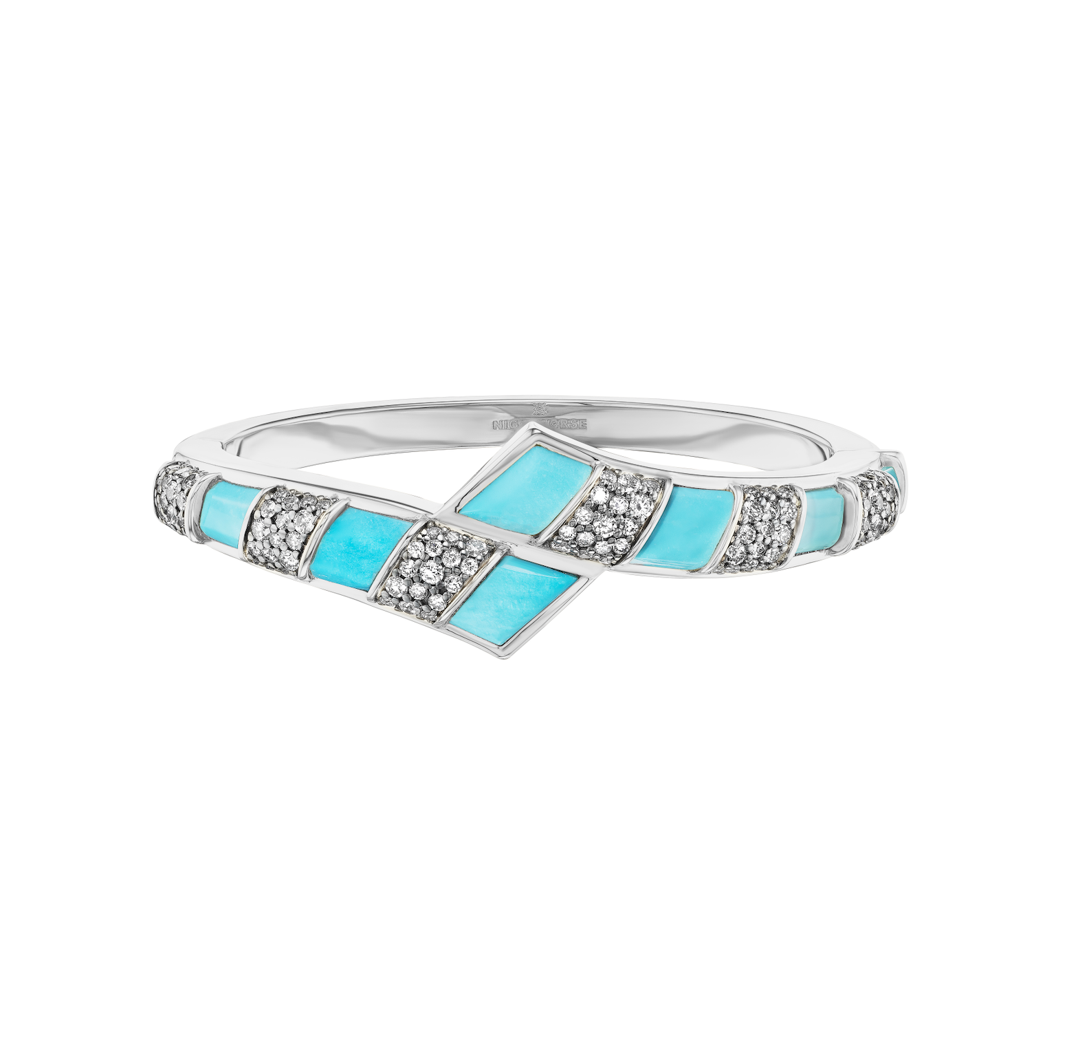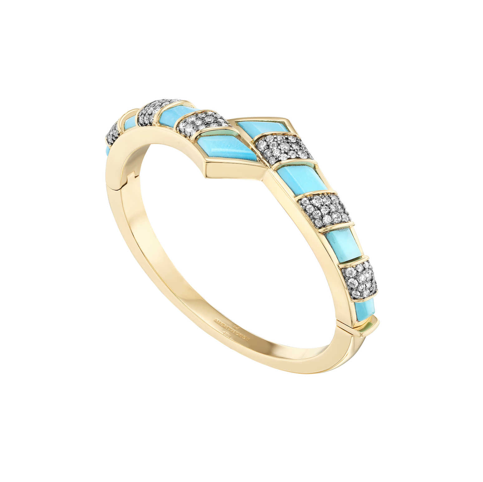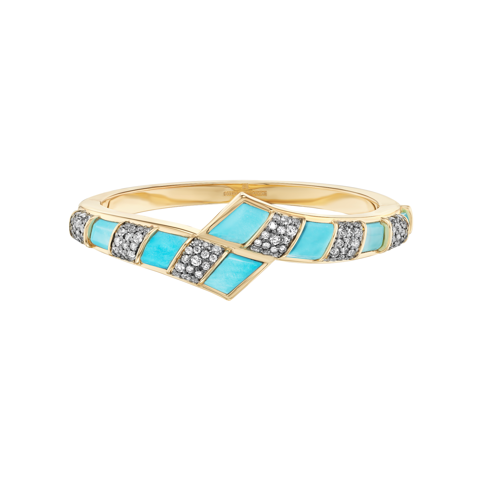 The new Rainbow bracelet is inlaid with diamonds and sleeping beauty turquoise and set in 18k gold or Platinum. Still the perfect symbol of unity and harmony and of making connections, it makes an elegant celebration gift for a wedding, anniversary, birthday, or just because. Pair it with the Rainbow ring or Rainbow Torque Necklace for a statement set.