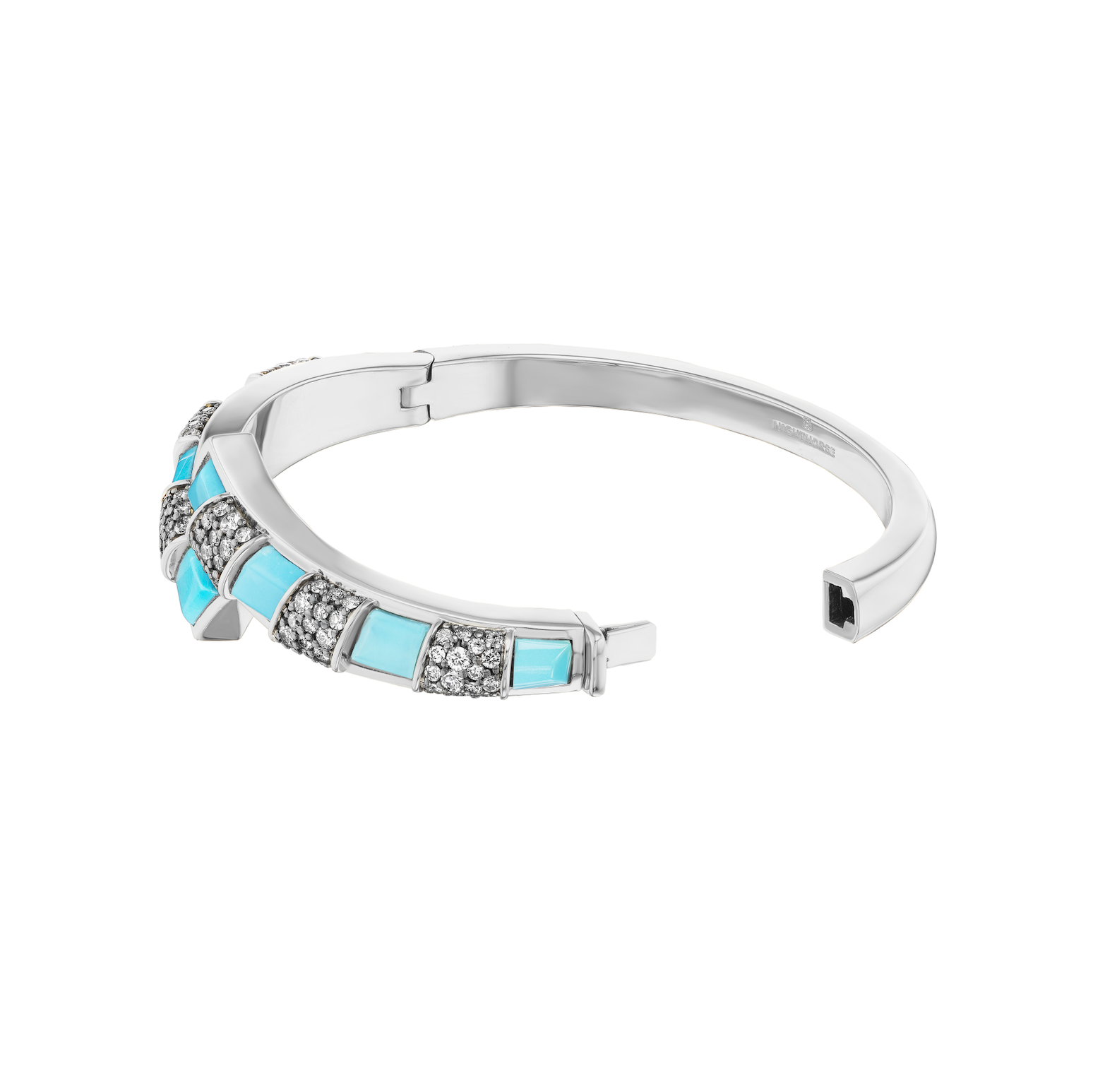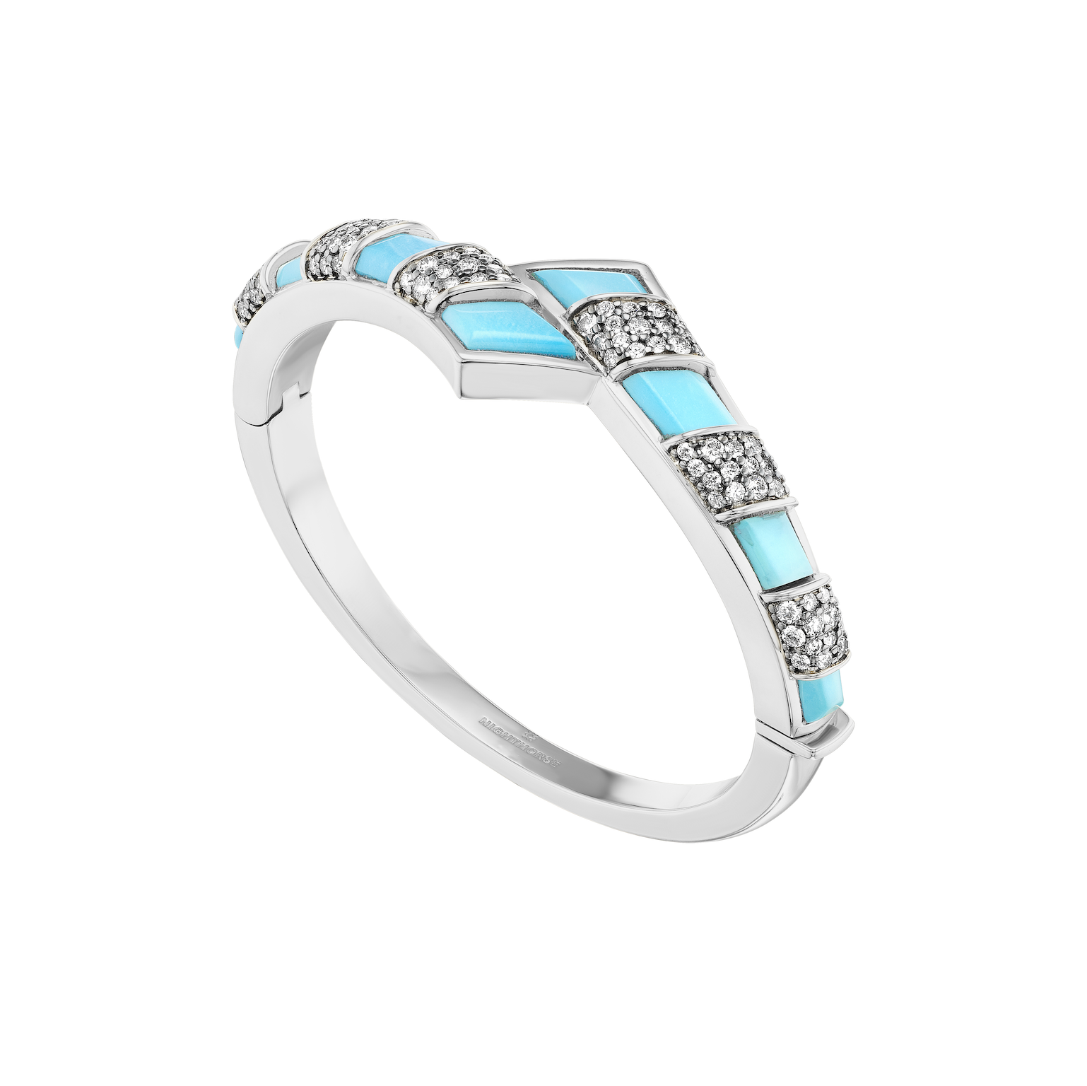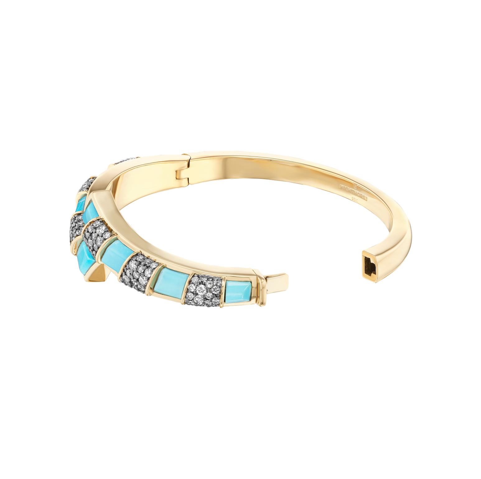 The new Rainbow bracelet is inlaid with diamonds and sleeping beauty turquoise and set in 18k gold or Platinum. Still the perfect symbol of unity and harmony and of making connections, it makes an elegant celebration gift for a wedding, anniversary, birthday, or just because. Pair it with the Rainbow ring or Rainbow Torque Necklace for a statement set.