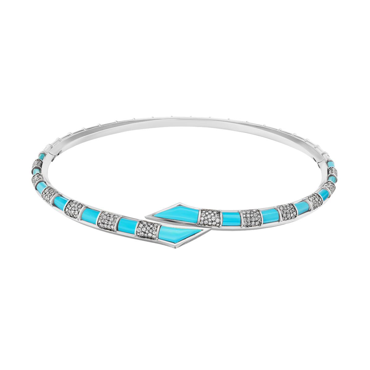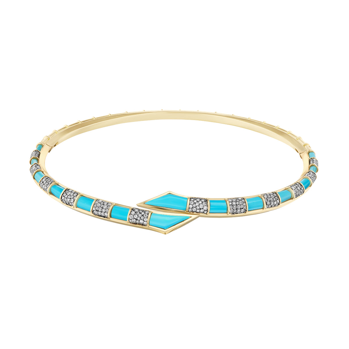 The Rainbow Torque Necklace is inlaid with diamonds and Sleeping Beauty Turquoise and set in 18k gold or Platinum. Still the perfect symbol of unity and harmony and of making connections, it makes an elegant celebration gift for a wedding, anniversary, birthday, or just because.